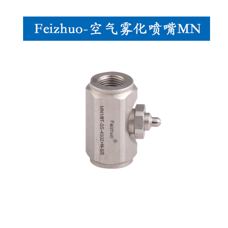 MN系列空氣霧化噴嘴特殊的內(nèi)部結(jié)構(gòu)設(shè)計(jì)能使液體和氣體均勻混合,產(chǎn)生微細(xì)液滴尺寸的噴霧或粗液滴噴霧。通常,通過增加氣體壓力或降低液體壓力可得到更加微細(xì)(30微米左右)的液滴噴霧,從而導(dǎo)致效高的氣體流率與液體率比。